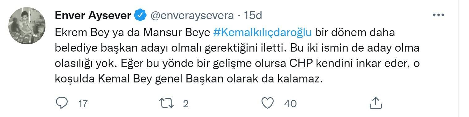 Kılıçdaroğlu'nun İBB Başkanı Ekrem İmamoğlu ve Ankara Büyükşehir Belediye Başkanı Mansur Yavaş'a bir dönem daha belediye başkanı adayı olmaları yönünde talimat verdiğini söyleyen Aysever, "Bu iki ismin de aday olma olasılığı yok. Eğer bu yönde bir gelişme olursa CHP kendini inkar eder, o koşulda Kemal Bey genel başkan olarak da kalamaz" dedi.