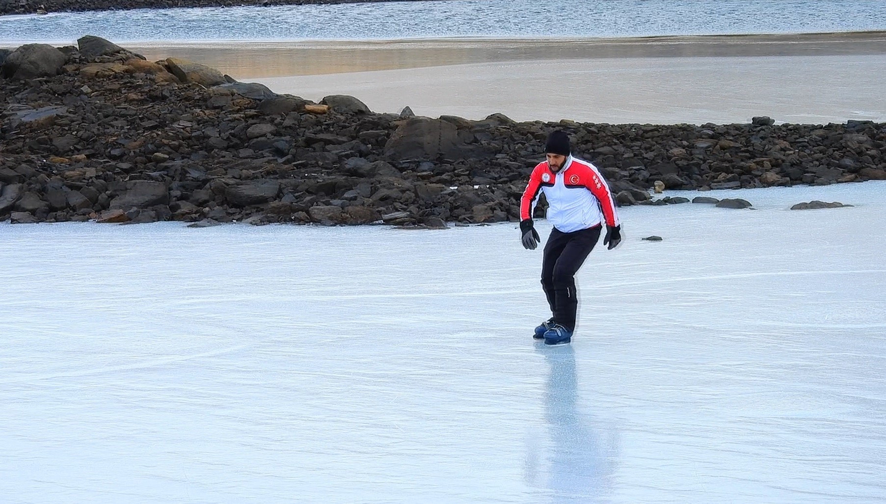 Erzincan’da kayak antrenörü Canser Atila, 3 bin 549 rakımlı Keşiş Dağlarında yer alan Yedi Göller mevkiinde unutulmaz bir deneyim yaşadı. Yüzeyi buz tutan gölet üzerinde buz pateni yapan Atila, eşsiz bir manzarada spor keyfi yaşadı.