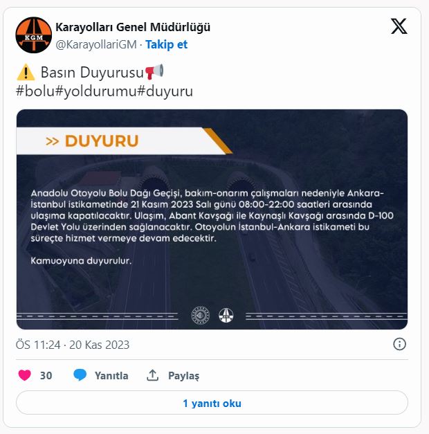 Karayolları Genel Müdürlüğü'nden yapılan açıklamada "Anadolu Otoyolu Bolu Dağı Geçişi, bakım-onarım çalışmaları nedeniyle Ankara- İstanbul istikametinde 21 Kasım 2023 Salı günü 08:00-22:00 saatleri arasında ulaşıma kapatılacaktır. Ulaşım, Abant Kavşağı ile Kaynaşlı Kavşağı arasında D-100 Devlet Yolu üzerinden sağlanacaktır. Otoyolun İstanbul-Ankara istikameti bu süreçte hizmet vermeye devam edecektir. Kamuoyuna duyurulur" denildi.