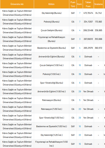Kıbrıs Sağlık ve Toplum Bilimleri Üniversitesi 2021 taban puanları ve yüzdelik dilimleri