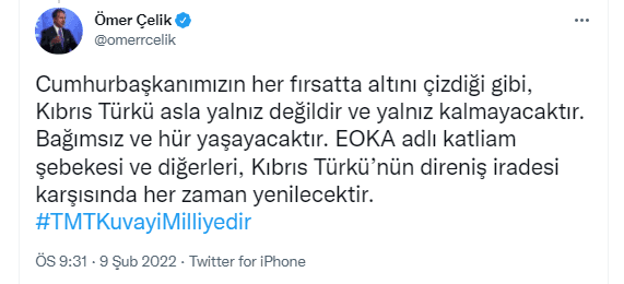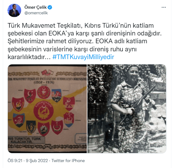 AK Parti Sözcüsü Ömer Çelik, Ayşenur Arslan'ın TMT'yi hedef almasından sonra Twitter hesabından açıklamada bulundu. "Türk Mukavemet Teşkilatı, Kıbrıs Türkü’nün katliam şebekesi olan EOKA’ya karşı şanlı direnişinin odağıdır." diyen Çelik, "Şehitlerimize rahmet diliyoruz. EOKA adlı katliam şebekesinin varislerine karşı direniş ruhu aynı kararlılıktadır." ifadelerini kullandı.