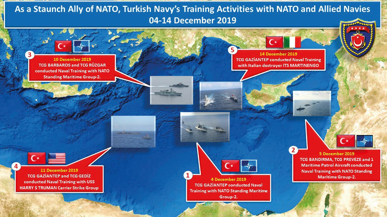 Yunanistan ve Kıbrıs Rum Yönetimi, NATO ve AB üyesi ülkeleri Doğu Akdeniz geriliminde Türkiye'ye karşı kışkırtırken, Akdeniz Kalkanı Harekâtı ile bölgenin en etkin donanması olan Türk Deniz Kuvvetleri'nin son 10 günde NATO müttefikleriyle yaptığı tatbikatlar, Rumlara önemli bir yanıt oldu. Türk Deniz Kuvvetlerinin son 10 gün 3'ü NATO Daimi Deniz Görev Grubu, 1'i ABD Uçak Gemisi Görev Grubu ve 1'i İtalyan Deniz Kuvvetleri ile olmak üzere NATO ve müttefik deniz kuvvetleri ile birlikte bölgede 5 ikili eğitim faaliyeti icra etti. İkili eğitim faaliyetleri Akdeniz haritasına tablodaki gibi yansıdı.