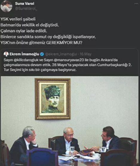 Twitter’da bir anda düğmeye basılarak, binlerce hesaptan aynı anda “Sandıklarda oyların çalındığı, YSK’nın verilerinin şaibeli olduğu” iddia edildi. Kılıçdaroğlu'na "YSK'nın önüne git" çağrısı yapıldı.