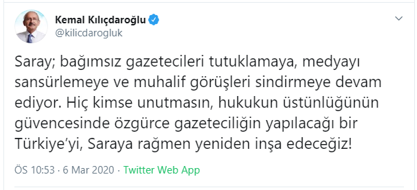 Konu hakkında Twitter hesabından bir paylaşım yapan CHP lideri, “Saray; bağımsız gazetecileri tutuklamaya, medyayı sansürlemeye ve muhalif görüşleri sindirmeye devam ediyor. Hiç kimse unutmasın, hukukun üstünlüğünün güvencesinde özgürce gazeteciliğin yapılacağı bir Türkiye’yi, Saraya rağmen yeniden inşa edeceğiz!” ifadelerini kullandı.