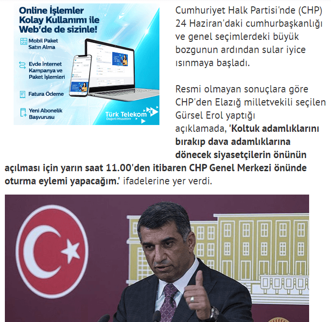 Gürsel Erol, CHP'nin 41 yıldır milletvekili çıkartılamadağı Elazığ'dan aday olarak, milletvekili seçilmişti. 2018 yılında, "Saat 11:00’de Genel Merkez önünde oturma eylemi başlatacağım." diyerek CHP yönetimine meydan okuyan Erol, partisinin 24 Haziran seçimindeki başarısızlığına isyan ederek, "Partimizin yaşadığı 24 Haziran seçim sonuçları başarısızlığının sorumlusu bu yönetim anlayışıdır. Mevcut Genel Merkez Yönetimini sıfat ve ünvanları ne olursa olsun bu mağlubiyetin sorumlusu olarak görüyorum ve derhal istifaya davet ediyorum." demişti.