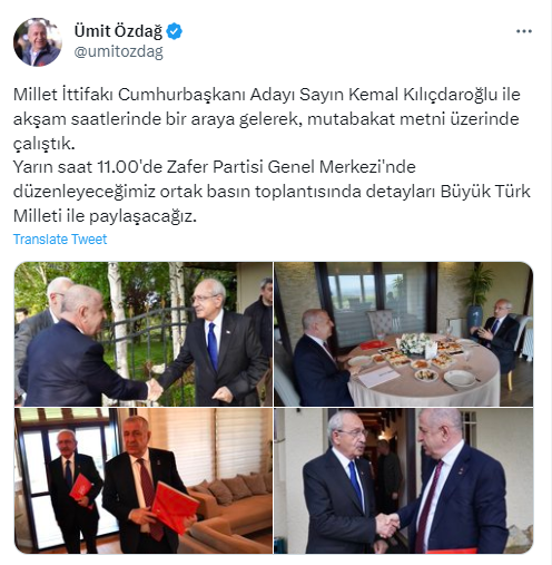 Süreç bu şekilde ilerlerken, Ümit Özdağ Twitter hesabından paylaşımda bulunarak, Kılıçdaroğlu ile anlaştıklarını duyurdu.