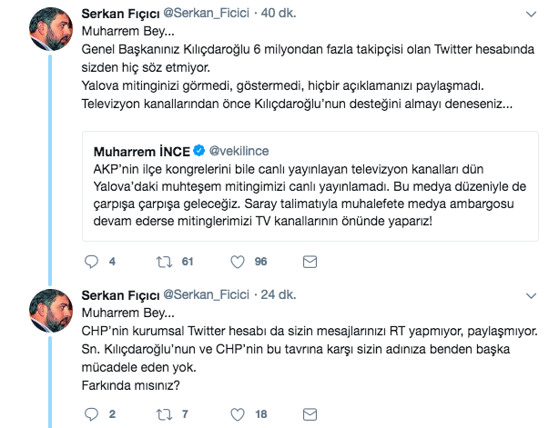 Mitinginin canlı yayınlanmamasına Twitter hesabı üzerinden isyan eden İnce'ye Akşam Gazetesi'nden Serkan Fıçıcı, "Muharrem Bey... Genel Başkanınız Kılıçdaroğlu 6 milyondan fazla takipçisi olan Twitter hesabında sizden hiç söz etmiyor. Yalova mitinginizi görmedi, göstermedi, hiçbir açıklamanızı paylaşmadı. Televizyon kanallarından önce Kılıçdaroğlu’nun desteğini almayı deneseniz..." cevabını vererek dikkat çekti.