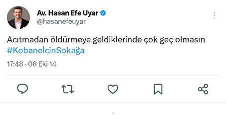 Erdoğan'a hakaretler savuran Uyar'ın ayrıca terör örgütü PKK'ya da destek veren ifadeleri de ortaya çıktı. Uyar, "Acıtmadan öldürmeye geldiklerinde çok geç olmasın Kobane için sokağa" ifadelerini kullandı.