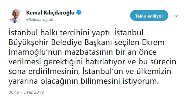 Kişisel Twitter hesabından attığı tweette Kılıçdaroğlu, İmamoğlu'nun mazbatasının bir an önce verilmesini talep ederken, itiraz sürecinin sona erdirilmesin, İstanbul'un ve Türkiye'nin yararına olacağını söyledi.