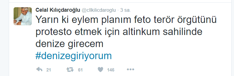 Son dönemlerde ağabeyi Kemal Kılıçdaroğlu’nun FETÖ ile yakınlığını protesto etmesi ile adını duyuran Celal Kılıçdaroğlu bu kez ilginç bir eyleme hazırlanıyor. Celal Kılıçdaroğlu FETÖ ile mücadeleye dikkat çekmek amacıyla denize gireceğini açıkladı.