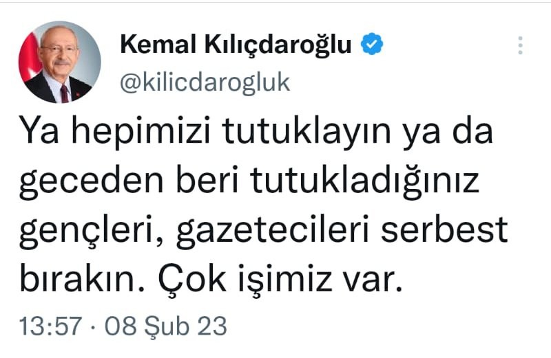 Twitter hesabından paylaşımda bulunan Kılıçdaroğlu, "Ya hepimizi tutuklayın ya da geceden beri tutukladığınız gençleri, gazetecileri serbest bırakın. Çok işimiz var." dedi.