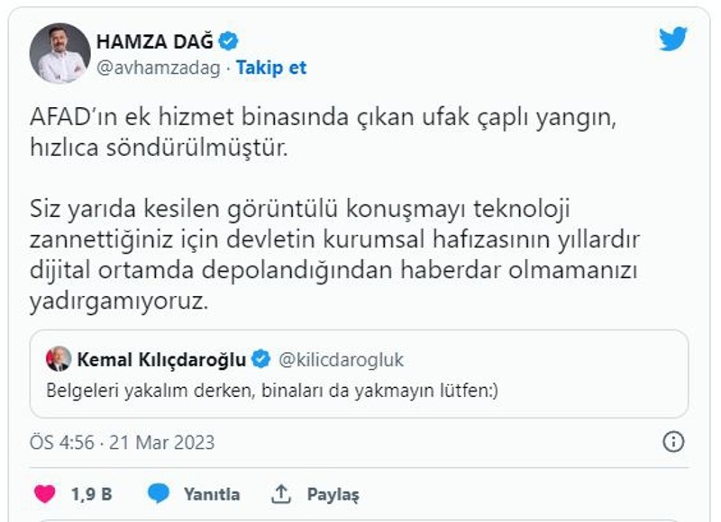 CHP Lideri Kemal Kılıçdaroğlu, AFAD'ın ek binasında sabah saatlerinde meydana gelen ufak çaplı yangın hakkında asılsız iddialarda bulundu. Kılıçdaroğlu'nun iddiasına tepki gösteren AK Parti Genel Başkan Yardımcısı Hamza Dağ, "Siz yarıda kesilen görüntülü konuşmayı teknoloji zannettiğiniz için devletin kurumsal hafızasının yıllardır dijital ortamda depolandığından haberdar olmamanızı yadırgamıyoruz" ifadelerini kullandı.