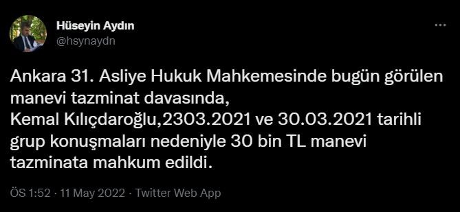"Ankara 31'inci Asliye Hukuk Mahkemesi'nde bugün görülen manevi tazminat davasında, Kemal Kılıçdaroğlu 23.03.2021 ve 30.03.2021 tarihli grup konuşmaları nedeniyle 30 bin TL manevi tazminata mahkum edildi."