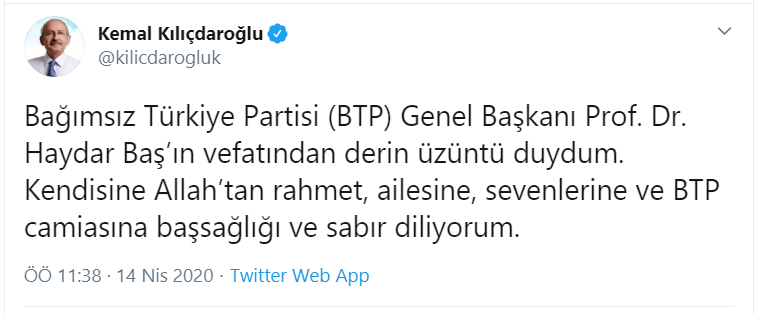 Kılıçdaroğlu, "Bağımsız Türkiye Partisi (BTP) Genel Başkanı Prof. Dr. Haydar Baş’ın vefatından derin üzüntü duydum. Kendisine Allah’tan rahmet, ailesine, sevenlerine ve BTP camiasına başsağlığı ve sabır diliyorum." ifadelerini kullandı.