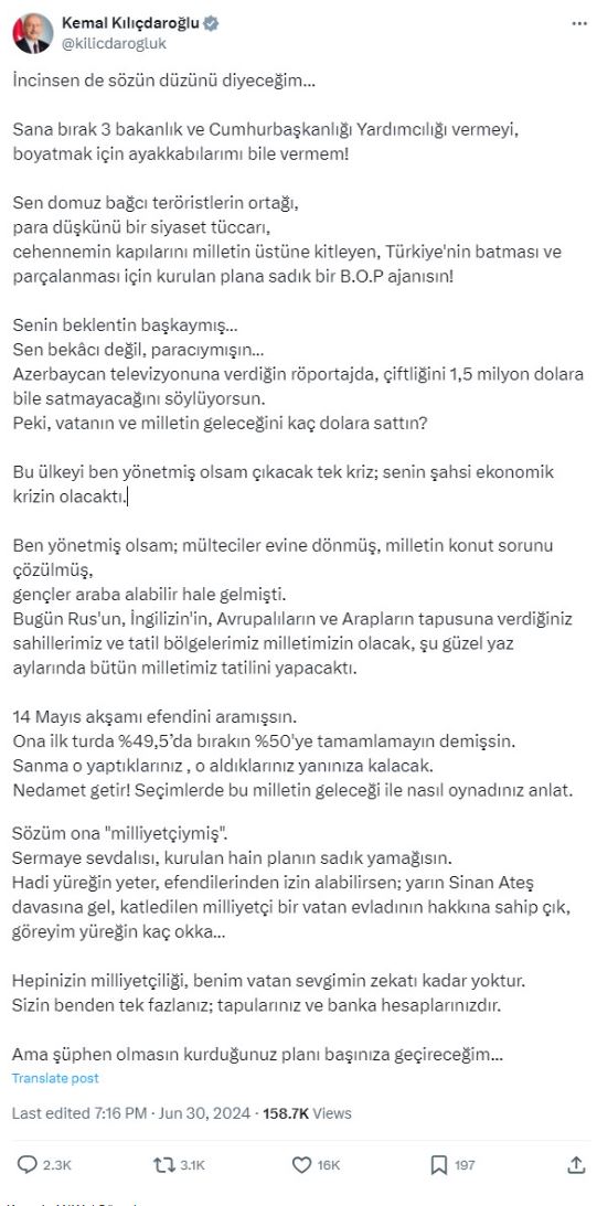 Sinan Oğan'ın sözlerine Kemal Kılıçdaroğlu'ndan zehir zemberek yanıt geldi. Sosyal medya hesabından açıklama yapan Kılıçdaroğlu, şunları söyledi: "İncinsen de sözün düzünü diyeceğim... Sana bırak 3 bakanlık ve Cumhurbaşkanlığı Yardımcılığı vermeyi, boyatmak için ayakkabılarımı bile vermem! Sen domuz bağcı teröristlerin ortağı, para düşkünü bir siyaset tüccarı, cehennemin kapılarını milletin üstüne kilitleyen, Türkiye'nin batması ve parçalanması için kurulan plana sadık bir B.O.P ajanısın!