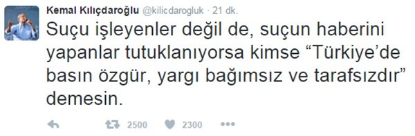 Bunun üzerine CHP Genel Başkanı Kılıçdaroğlu, Fetullahçı Terör Örgütü’nden (FETÖ) gelen montaj belgeleri gazetesinde yayınlayan Can Dündar'a arka çıkarak, Twitter'dan, "Suçu işleyenler değil de, suçun haberini yapanlar tutuklanıyorsa kimse 'Türkiye’de basın özgür, yargı bağımsız ve tarafsızdır' demesin" şeklinde skandal ifadeler kullandı.