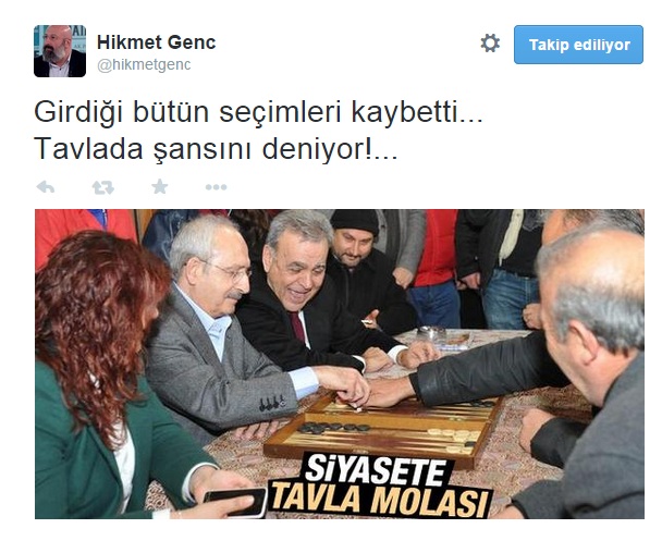 Yeni Şafak gazetesi yazarı Hikmet Genç ise Twitter hesabı üzerinden, Kılıçdaroğlu'nun tavla oynamasını, "Girdiği bütün seçimleri kaybetti. Tavlada şansını deniyor" şeklinde yorumladı.