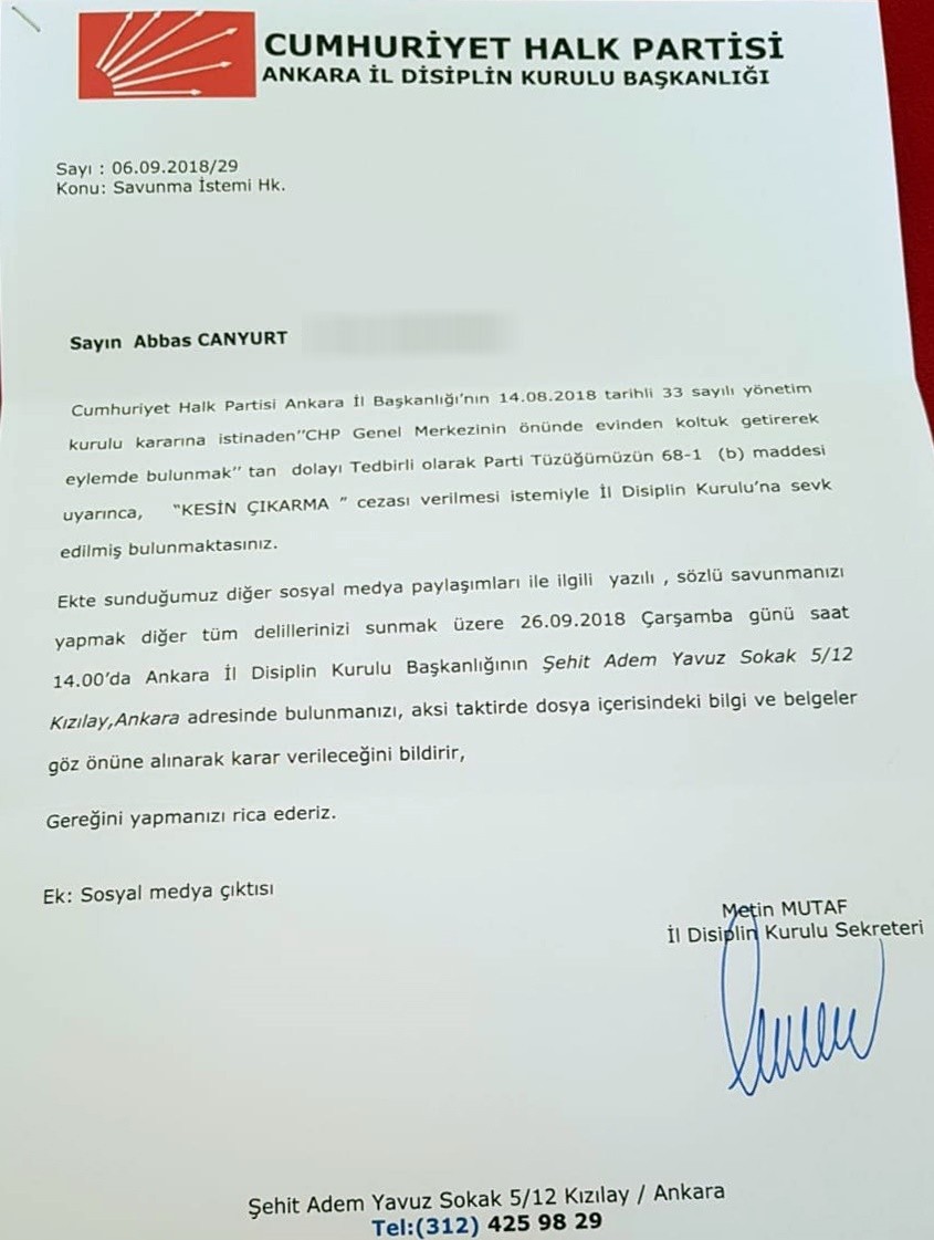 CHP Ankara Keçiören İlçe Teşkilatı üyesi Abbas Canyurt, CHP Genel Merkezi önünde evinden getirdiği koltuğa oturtarak Kemal Kılıçdaroğlu'nu protesto etmesinin ardından disipline sevk edildi. CHP Ankara İl Başkanlığı Disiplin Kurulu, Canyurt hakkında işlem başlatarak, 'kesin çıkarma' talebiyle savunmasını istedi.