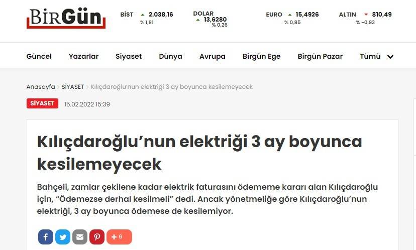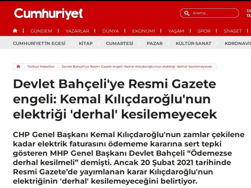 CHP'ye yakın medya kuruluşları, Kemal Kılıçdaroğlu'nun 'Zamlar geri çekilene kadar elektrik faturamı ödemeyeceğim.' şeklindeki provokatif söylemine, "Ödemezse elektriği derhal kesilmeli." tepkisi gösteren MHP Genel Başkanı Devlet Bahçeli'yi hedef aldı. Cumhuriyet ve Birgün gazeteleri "yaş" gerekçesi ile provokasyona destek verdi.