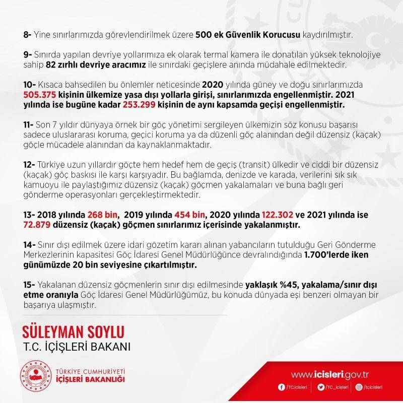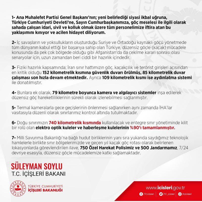 İçişleri Bakanı Süleyman Soylu, CHP Genel Başkanı Kemal Kılıçdaroğlu'na seslendi. "Göç ile ilgili olarak sahada çalışan idari, sivil ve kolluk olmak üzere tüm personelimize iftira atan bu yaklaşımını kınıyor ve acilen hidayet diliyorum" ifadelerini kullanan Soylu, Kılıçdaroğlu'nun iftiralarına ilişkin tek tek açıklama yaptı.