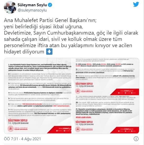 İçişleri Bakanı Süleyman Soylu, CHP Genel Başkanı Kılıçdaroğlu'nun "göçmen" açıklamalarına ilişkin sosyal medya hesabından tek tek iftiraları yalanladı.