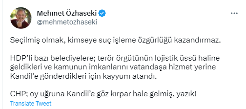 Twitter hesabından yaptığı paylaşımla Kılıçdaroğlu'nu eleştiren Özhaseki, “Seçilmiş olmak, kimseye suç işleme özgürlüğü kazandırmaz. HDP’li bazı belediyelere terör örgütünün lojistik üssü haline geldikleri ve kamunun imkanlarını vatandaşa hizmet yerine Kandil'e gönderdikleri için kayyum atandı. CHP oy uğruna Kandil’e göz kırpar hale gelmiş, yazık” dedi.