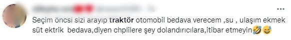 Sosyal medya üzerinden paylaşım yapan binlerce vatandaş daha önce seçimlerde vatandaştan oy almak için “CHP’ye oy verene traktör bedava” yalanını hatırlatarak CHP’nin oy almak için ortaya attığı yeni bir yalan vurgusu yaptılar.
