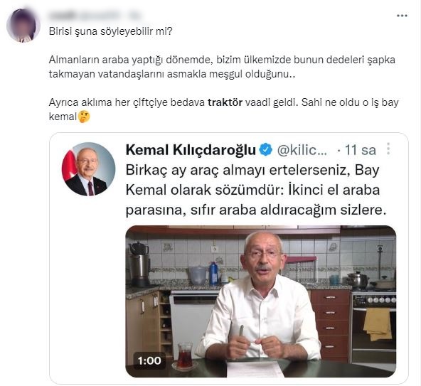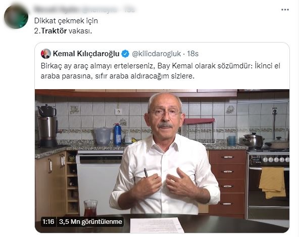 Paylaşım yapan sosyal medya kullanıcıları, “Dikkat çekmek için ikinci traktör vakası” , “Bay Kemal, İkinci el araba parasına sıfır araba aldıracağım demiş. Şey gibi mi mesela, her çiftçiye bedava traktör sözü verdiğiniz gibi mi, merak ettim” , “Seçim öncesi sizi arayıp traktör otomobil bedava vereceğim ,su , ulaşım ekmek süt elektrik bedava, diyen CHP'lilere şey dolandırıcılara, itibar etmeyin” , “Birisi şuna söyleyebilir mi? Almanların araba yaptığı dönemde, bizim ülkemizde bunun dedeleri şapka takmayan vatandaşlarını asmakla meşgul olduğunu.. Ayrıca aklıma her çiftçiye bedava traktör vaadi geldi. Sahi ne oldu o iş bay kemal” ifadelerini kullandılar.