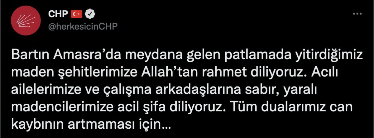 CHP'nin maden faciası ilişkin mesajında, "Bartın Amasra’da meydana gelen patlamada yitirdiğimiz maden şehitlerimize Allah’tan rahmet diliyoruz. Acılı ailelerimize ve çalışma arkadaşlarına sabır, yaralı madencilerimize acil şifa diliyoruz. Tüm dualarımız can kaybının artmaması için…" denildi.