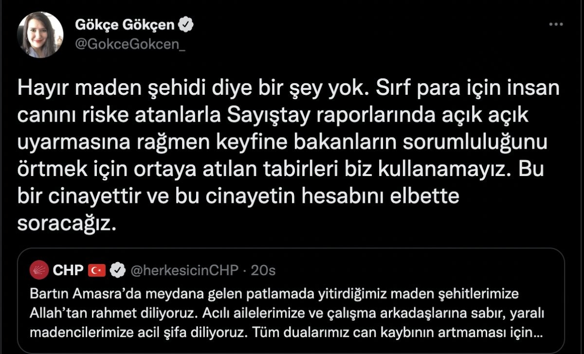 Mesajın ardından CHP Genel Başkan Yardımcısı Gökçe Gökçen, Bartın'ın Amasra ilçesindeki maden faciasına ilişkin partisinin yaptığı açıklamaya tepki gösterdi.