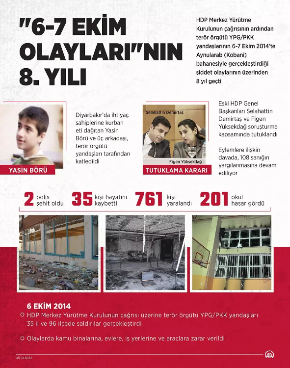 HDP Merkez Yürütme Kurulunun çağrısının ardından terör örgütü YPG/PKK yandaşlarının 6-7 Ekim 2014'te Aynularab (Kobani) bahanesiyle gerçekleştirdiği, 2 polisin şehit olduğu, 35 kişinin yaşamını yitirdiği şiddet olaylarının üzerinden 8 yıldan fazla geçti.