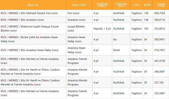 Kilis liseleri taban puanı 2021 yüzdelik dilimleri|Kilis liseleri kontenjanları