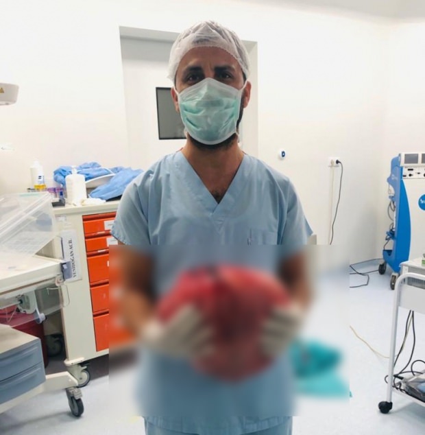 Kadın Hastalıkları ve Doğum Uzmanı Op. Dr. Murat Özşahin, 2,5 saat süren operasyonun ardından kadının rahmindeki 7 kilogramlık tümörü aldı.