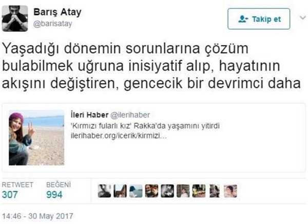 Gezi kalkışmasında 'kırmızı fularlı kız' olarak tanınan PKK'lı terörist Ayşe Deniz Karacagil'e destek veren de yine Barış Atay'dı. Atay, Rakka'da PKK saflarında savaşırken öldürülen terörist Karacagil'i şu sözlerle övdü.