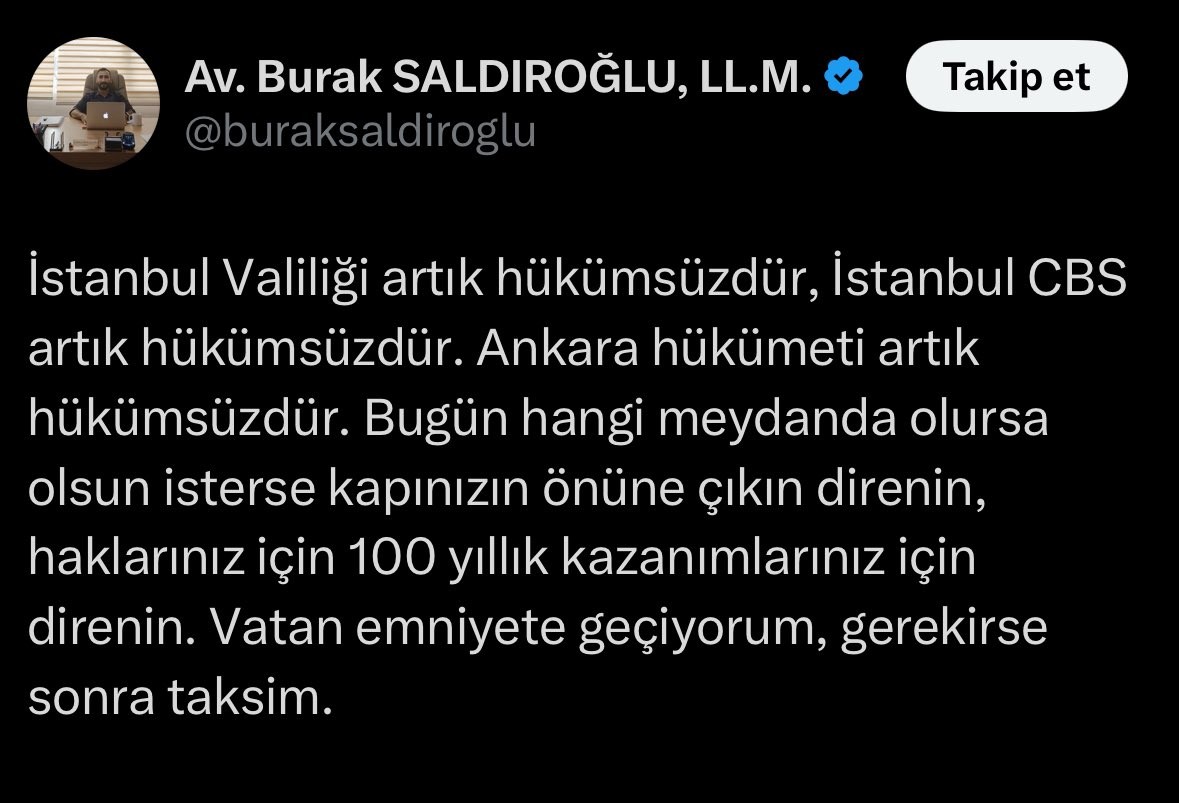Sosyal medyada Av. Burak Saldıroğlu, halka sokak çağrısında bulundu. Saldıroğlu 'İstanbul Valiliği artık hükümsüzdür, İstanbul CBS artık hükümsüzdür. Ankara hükümeti artık hükümsüzdür. Bugün hangi meydanda olursa olsun isterse kapınızın önüne çıkın direnin, haklarınız için 100 yıllık kazanımlarınız için direnin. Vatan emniyete geçiyorum, gerekirse sonra taksim.' diyerek halkı provoke etmeye kalkıştı. Sözde avukat daha sonra 'Artık rahat uyuduğumuz evlerimiz de fiili hapishanedir. Çıkın sokağa.' tweeti attı. İşte o paylaşımlar: