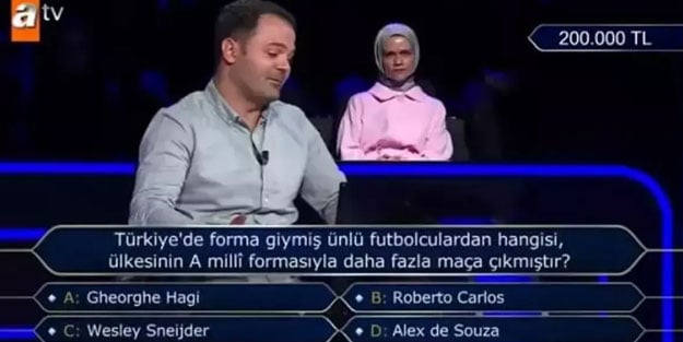 200 bin TL değerindeki olan "Türkiye’de forma giymiş ünlü futbolculardan hangisi, ülkesinin A milli formasıyla daha fazla maça çıkmıştır?" sorusu soruldu.
