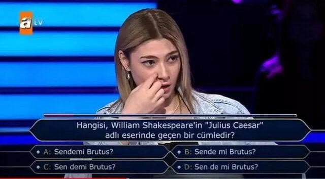 Yarışmaya ablasıyla birlikte katılan Simay'ın 5 bin lira değerindeki 4'üncü soruda karşısına 'Hangisi, William Shakespeare'in "Julius Caesar" adlı eserinde geçen bir cümledir?' sorusu çıkmıştı.