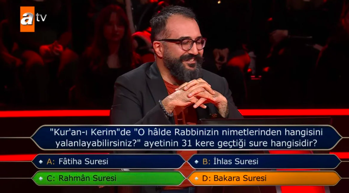 Yarışmacının karşısına 300 bin TL'lik soruda, "Kur'an-ı Kerim" de "O halde Rabbinizin nimetlerinden hangisini yalanlayabilirsiniz?" ayetinin 31 kere geçtiği sure hangisidir? sorusu çıktı.