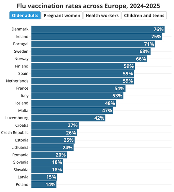Danimarka dışında yalnızca İrlanda, Portekiz ve İsveç, yaşlıların en az yüzde 75'inin influenza aşılı olması yönündeki AB hedefini yakalamaya yaklaşabildi.