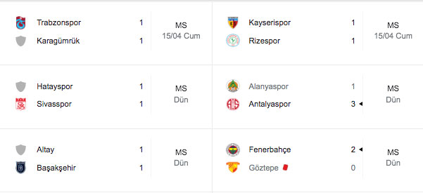 Süper Lig'in 33. haftasında Fenerbahçe, sahasında Göztepe'yi 2-0 mağlup ederken, Altay, Başakşehir'le berabere kalarak 3 hafta sonra puan aldı. Atakaş Hatayspor ile Demir Grup Sivasspor, 1-1 berabere kaldı. Süper Lig’de 33. haftanın heyecanı dün olduğu gibi bugün de devam edecek. Peki bugün hangi maçlar var? Bugün kimin maçı var? Bu akşam hangi maç var, hangi kanalda? İşte 17 Nisan2022 Pazar günü maç programı, Süper Lig, İngiltere (Premier Lig), İspanya (La Liga), İtalya (Serie A), Almanya (Bundesliga) ve Fransa'daki (Ligue 1) maçlar, maç saati ve maçların yayınlanacağı kanallar.