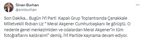 "Bugün İYİ Parti Kapalı Grup Toplantısında Çanakkale Milletvekili Rıdvan Uz 'Meral Akşener Cumhurbaşkanı ile görüştü. O nedenle genel merkezimizden ve odalardan Meral Akşener’in tüm fotoğraflarını kaldıralım” demiş. İYİ Partide kaynama devam ediyor."