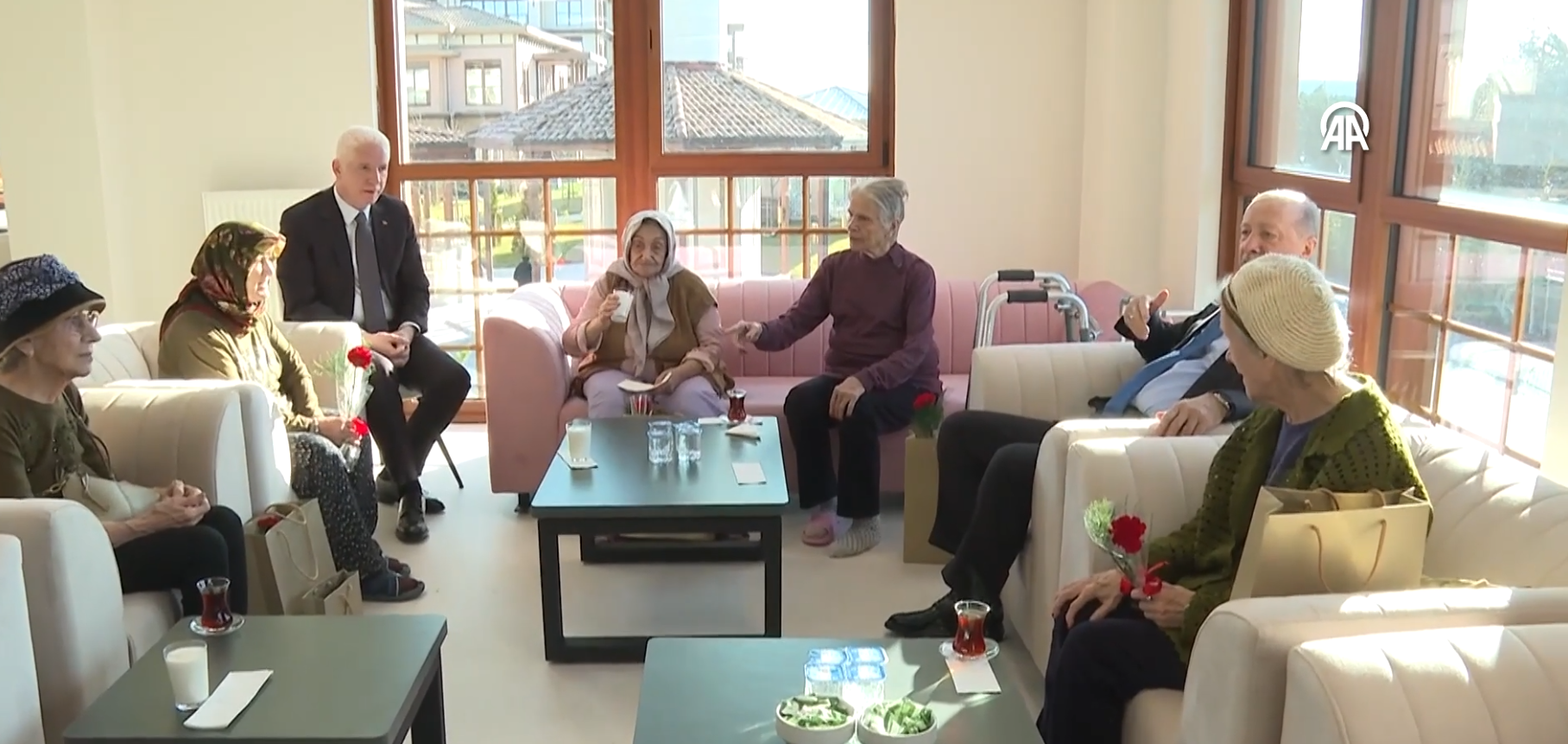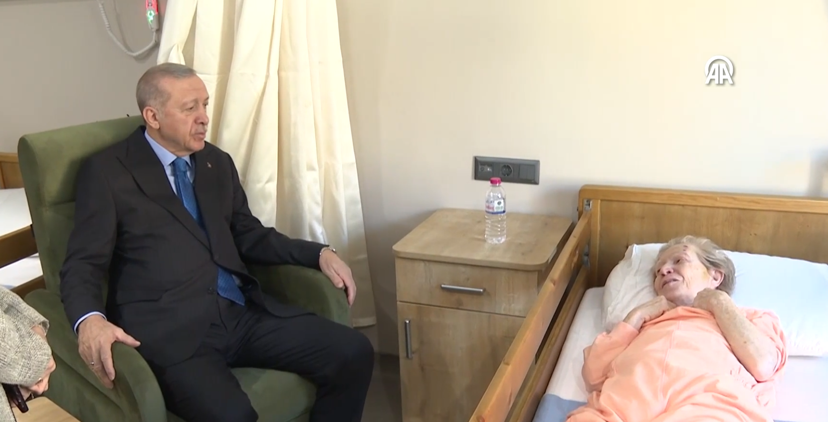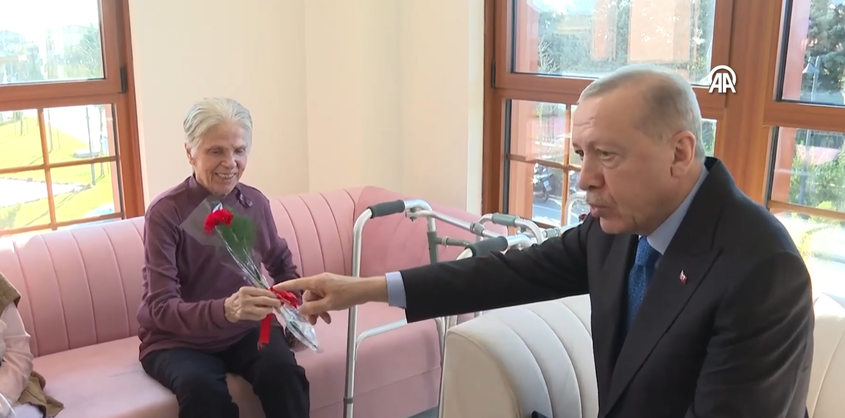 Bir yaşlı kadına Erdoğan, Darülaceze'den ayrılmaması için "Masan var, her şeyin var. Burada devam etsen olmaz mı? Bak başkanımız 'Burada odası, masası her şeyi var' diyor. O zaman buradan gitmeye gerek yok" diye konuştu. Yaşlı kadın "Kimsem yok" derken, Erdoğan'dan "Biz varız biz" cevabı geldi.