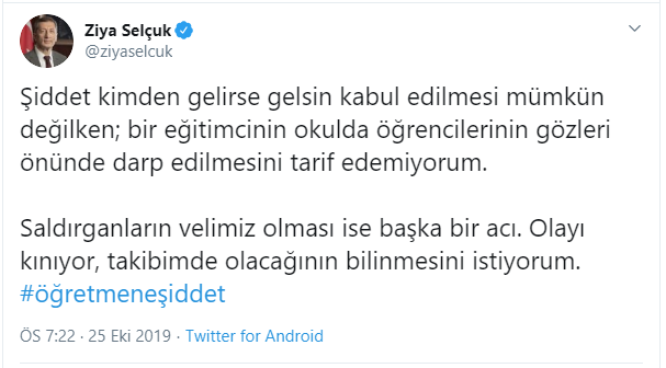Tepki çeken olayla ilgili açıklama yapan Milli Eğitim Bakanı Ziya Selçuk, "Şiddet kimden ve hangi gerekçeyle gelirse gelsin kabul edilmesi mümkün değilken; bir eğitimcinin okulda öğrencilerinin gözleri önünde darbedilmesini tarif edemiyorum. Saldırganların velimiz olması ise başka bir acı. Olayı kınıyor, takibimde olacağının bilinmesini istiyorum."