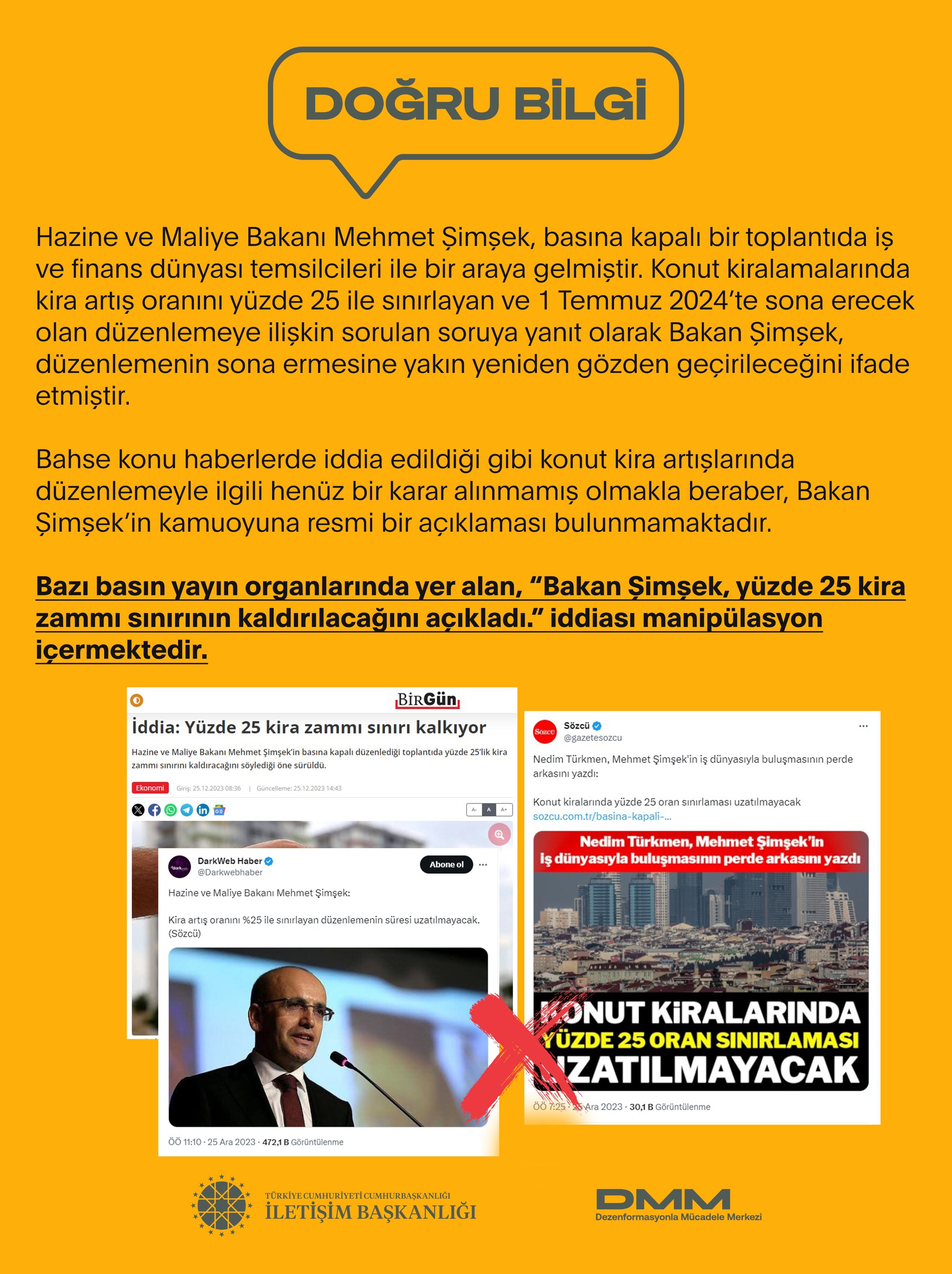 Bazı gazetelerde, Hazine ve Maliye Bakanı Mehmet ŞimşekMehmet Şimşek'in, "Kira zammında yüzde 25 sınırlaması kaldırılıyor" dediği iddia edildi.