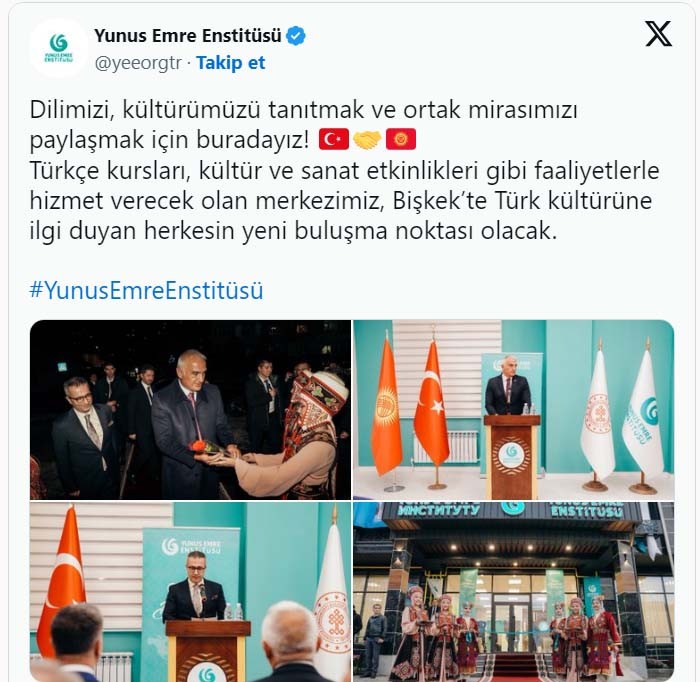 Yunus Emre Enstitüsü, sosyal medya hesabından, "Dilimizi, kültürümüzü tanıtmak ve ortak mirasımızı paylaşmak için buradayız." ifadelerini kullanarak Kırgızistan'ın başkenti Bişkek'te Türk Kültür Merkezi'nin açıldığını duyurdu.
