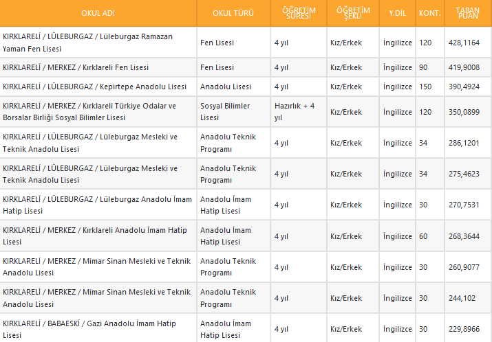 Kırklareli liseleri taban puanı 2021 yüzdelik dilimleri|Kırklareli liseleri kontenjanları