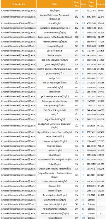Kırklareli Üniversitesi 2021 taban puanları ve yüzdelik dilimleri nelerdir?