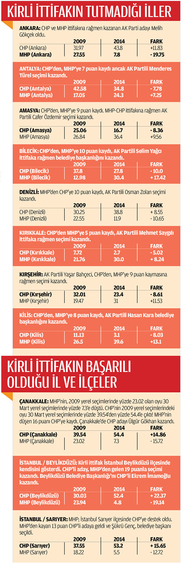 KENAN KIRAN / ŞUAYİP ALABAY - 30 Mart yerel seçimlerde AK Parti’ye karşı oluşturulan kirli ittifakı gözler önüne seriyoruz. MHP ve CHP’nin; birçok il ve ilçede AK Parti’ye karşı ittifak yapmasına rağmen başarılı olmadığı açıkça görülüyor. Çanakkale’de ise MHP’den gelen yüzde 15’lik oyla CHP adayı belediye başkanı seçildi. AK Parti; kirli ittifaka rağmen Ankara, Antalya, Amasya, Bilecik, Denizli, Kırıkkale, Kırşehir ve Kilis’te belediye başkanlığını kazandı. Kirli ittifak, Çanakkale ve İstanbul Beylikdüzü ve Sarıyer ilçelerinde açık şekilde kendisini gösterdi. CHP’li adaylara MHP’den Çanakkale’de 16 puan, Beylikdüzü’nde 19 puan, Sarıyer’de 13 puan geldi. Gazetemiz, CHP-MHP’nin ittifak yaptığı il ve ilçeleri çıkardı.
