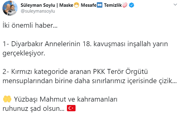 İçişleri Bakanı Süleyman Soylu, sosyal medya hesabından iki ayrı müjde verdi. Soylu, kırmızı kategoride aranan PKK'lı teröristin etkisiz hale getirildiğini ve HDP önünde, kaçırılan çocukları için eylem yapan Diyarbakır annelerinin 18. kavuşmasının gerçekleşeceğini duyurdu.