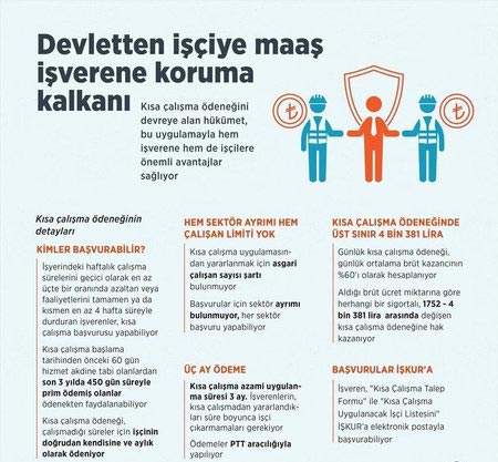 Kısa çalışma uygulaması ve kısa çalışma ödeneği İşsizlik Sigortası Kanununda düzenlenmiştir. Uygulama ile genel ekonomik, sektörel, bölgesel kriz veya zorlayıcı sebeplerle işyerindeki haftalık çalışma sürelerinin geçici olarak en az üçte bir oranında azaltılması veya süreklilik koşulu aranmaksızın işyerinde faaliyetin tamamen veya kısmen en az dört hafta süreyle durdurulması hallerinde, işyerinde üç ayı aşmamak üzere sigortalılara çalışamadıkları dönem için gelir desteği sağlanmaktadır.
